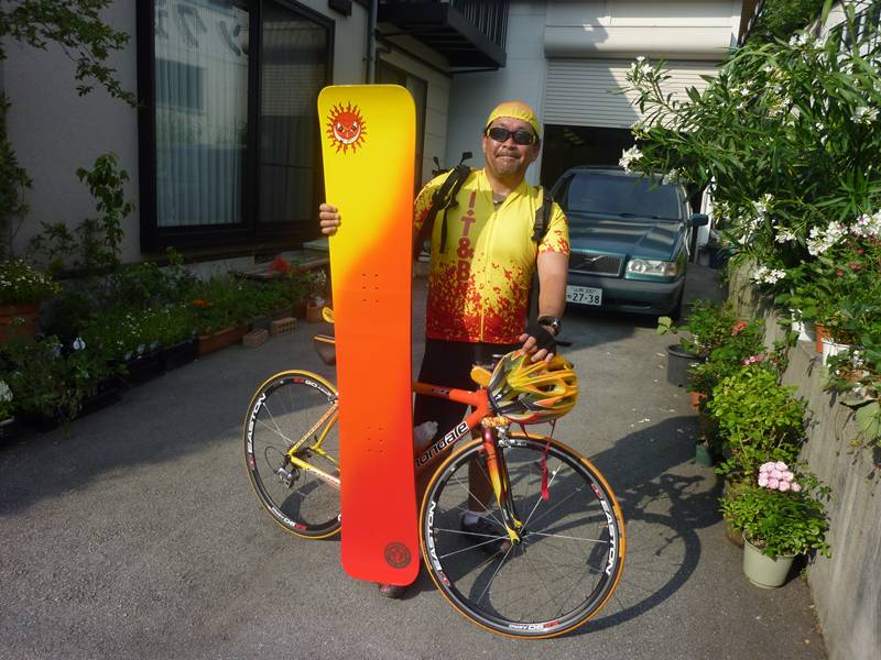 oonoさんのお友達のnakazawaさん。お二人とも歯医者さん。春に試乗でこの板に乗ってもらって、そのままお譲りしました!。・・・で、黄色、オレンジ、赤でペイントしてーって事で、それはハワイが好き!ハワイアンカラーが好きなので!ってお聞きしてましてPしましたが、今日、全身ハワイアンカラーで登場!したnakazawaさんを見て納得!。今日、リペア板持ってきて下さいましたカムスポookiさんもこ板すごい色ですねーって!。