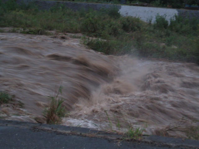 写真の川はうちのそばの金川。いつもは川幅2メートル?くらいなちょろちょろな川なんです。・・・が、大雨降ると豹変するのですよ(汗)。この金川は、上流がmisakaスキー場のほうなのであのあたりの山に降った雨が金川に流れるのですよ。misakaスキー場の雪解け水も金川に流れて・・・。