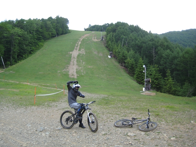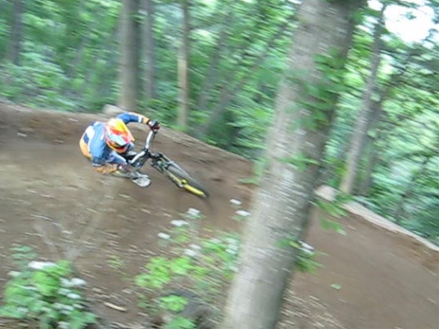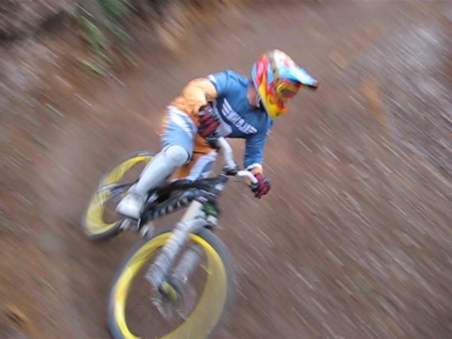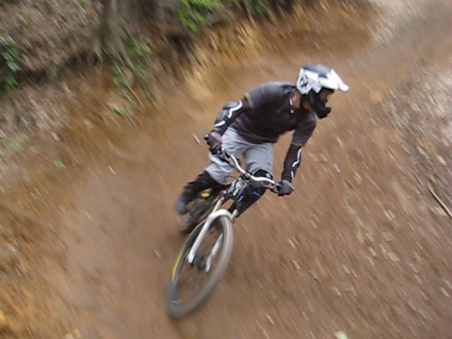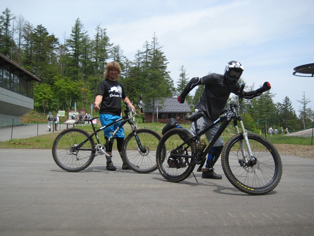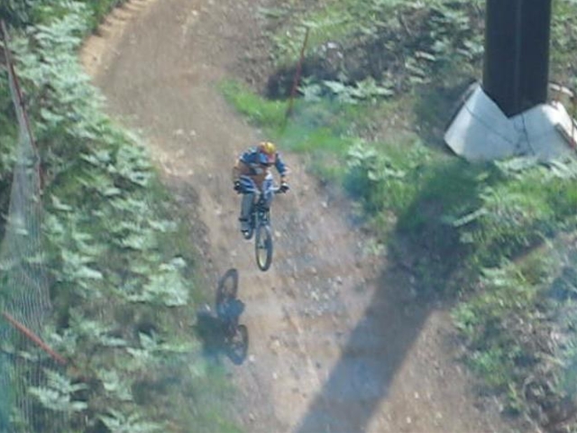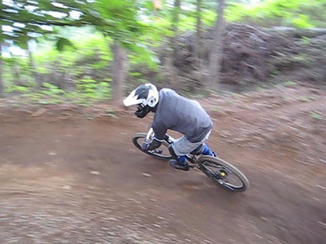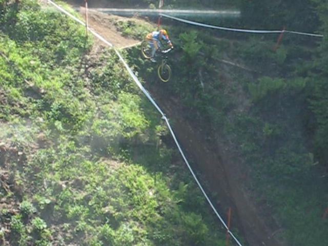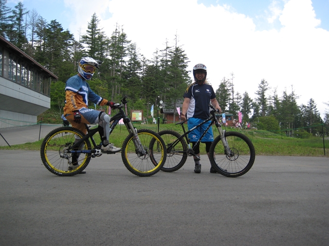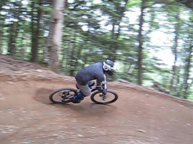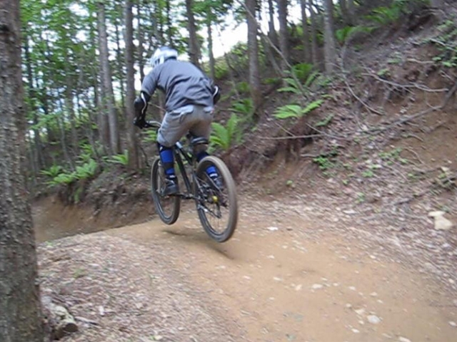 ・・・今日のムービーを見てもらえると、パノラマって言うかちゃりDHってこんな所を走っているんだーってリアルに感じてもらえると思います。コース上は石や岩や木の根や・・・コースの両脇は木がむき出しで立ってるし・・・セーフティーゾーン無し!超あぶなー( ̄〇 ̄;)。