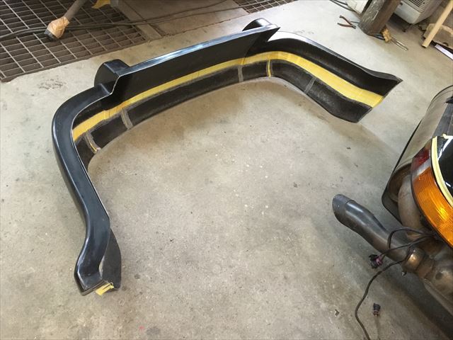 ・・・で、リヤバンパー決まったのでやっとリヤフェンダーの位置決め出来ます。部品で来たのはデカいけど、実際に使うのは1/3。これは実車に合わせながら大きさ決めするのですが、そんなの知らない人は来た部品をそのまま使おうとする^^;。そうすると大変な事になります^^;。ま~取説もマニュアルもググってもそんなの出て来ないから仕方がないです。経験して勉強するしか無い。ドッキングのベストポイントがある。それは経験しないとわからない。