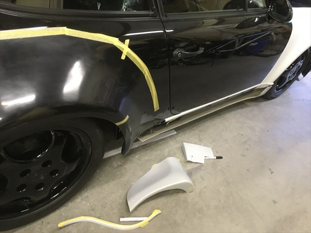 ・・・で、純正フェンダーをCUT。で、純正鉄フェンダーにFRPターボフェンダーを接着、ピンポイントでビス止め、のち、その合わせ面をガラスマット(FRP)じゃなくて今回はケブラー繊維貼って補強しようと思います。で、フェンダー決まったらサイドステップ作ります。