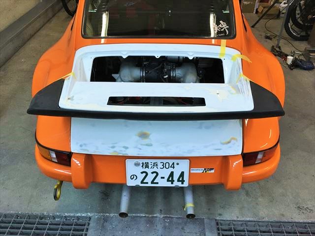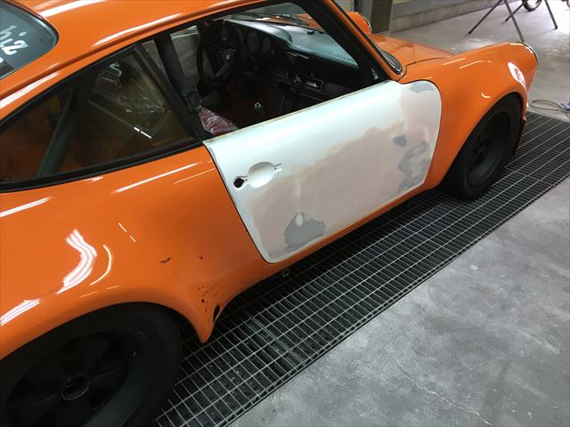 ・・・FRP製品って、原型、例えばこのドアだったら純正ドアから型取りして雌型を作ります。表と裏があるので雌型2つ。その型から表と裏の部品を作り、それを合わせて(接着する)一つのドアになります。それはウイング、ボンネットも同じ。その合わせる時だったり、雌型にグラスファイバーを積層してゆく時の樹脂の硬化状態だったりで表面歪んじゃたりします。たとえばこれが純正部品だったら商品にならない失敗品。社外パーツはこんなの普通。・・・でパテ修正。