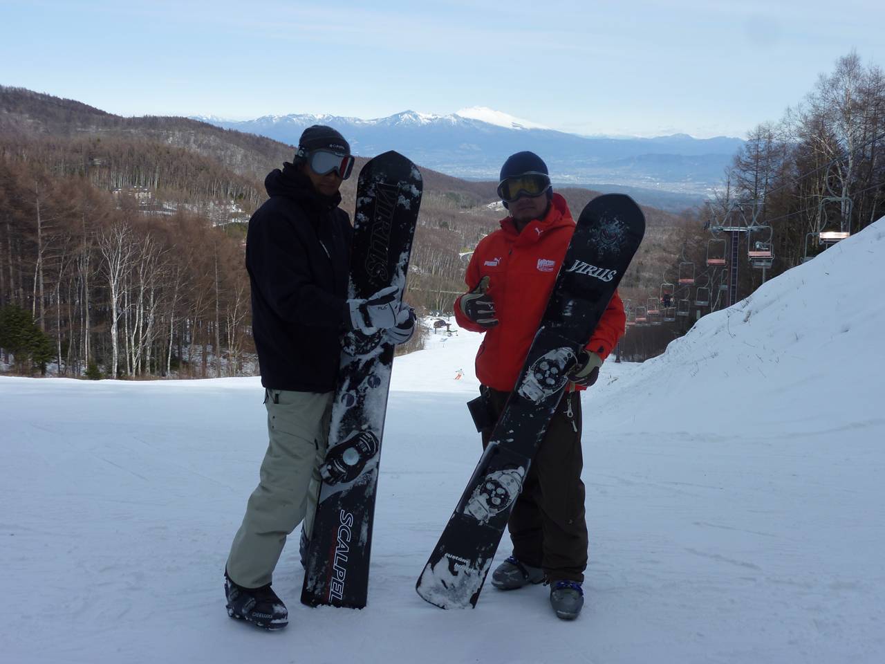 shimaさんに合うナローじゃないVIRUSの板を探していたのですが全く無くて、これは新品しかないなって事で乗った事なかったけどScalpelが合いそうだから今期モデル勝手に注文してしまいました(汗)。乗ってみてもらって良かったら買ってもらえればって思ってたのですが、とりあえずsのが乗ってみて!って事で乗ってみてた所すごーい良かったのでshimaさんに自信をもってお勧め出来る!なんて思いましたが、sののインプレ見たら良さそうじゃん!って事でshimaさんが乗られる事になりました!。shimaさんも先週、さっそくScalpel持って今期初滑りに八千穂に行ってきて、Scalpelすごーく良かった!って言ってもらえたのですごーくうれしかったです!。今日も今期二日目?ってぐらなライディング!で、背高いし手足長いのでm-hiroさんと外国人みたい!って話してました!。