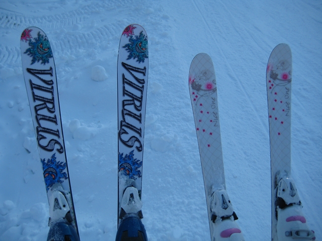 ・・・なのでさくら先生にレクチャーしてもらいました(汗)。いやーさくらちゃんとuchidaさんから教えてもらった事は全部覚えているみたいで、ほんとその通りに教えてくれる。エッジの角付けから目線、ストックで雪にこんな風に曲って~・・・なんて書かれちゃったし(汗)。・・・sの滑りは多分ゲレンデ一ダサかったけど、なんてったってこのVirusスキーが一番可愛くクールでカッコ良かったです!それだけで満足(汗)。