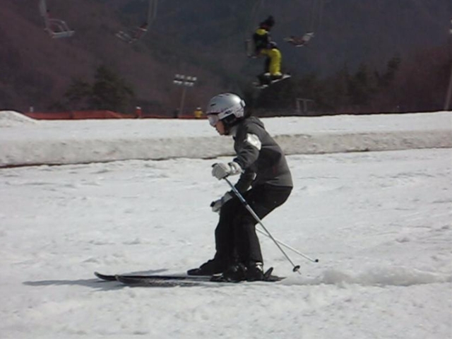 今日は昨日よりも雪は柔らかめ、まさに春スキー!。お客さんも昨日よりも多く、バックミュージックも復活してゲレンデにも春が来たみたいでしたよ!。圧倒的におじさんが多い中(汗)、やはり女の子が居てくれるとゲレンデに花が咲いているみたいです!。