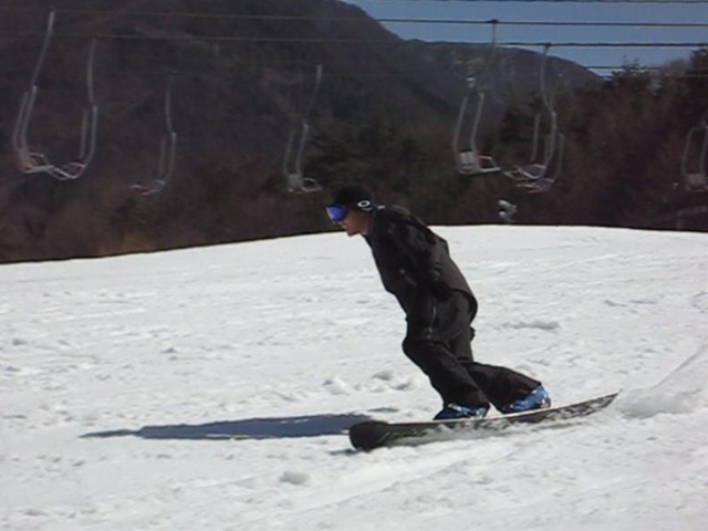 ボードの初期の立ち方やターンインのフィーリングは同じ感じで、フォールラインを越えたあたりからのフィーリングが違います。Evo・・・速っ・・・(汗)。フォールライン通過後、お・ち・て・ゆ・き・た・い・・・と、加速モードです(汗)。そこからキリ上げようとすると、キリ上がらないようにEvoくん抵抗してきます(汗)。これはEvoくんに逆らってはいけないと言う事みたいです(汗)。