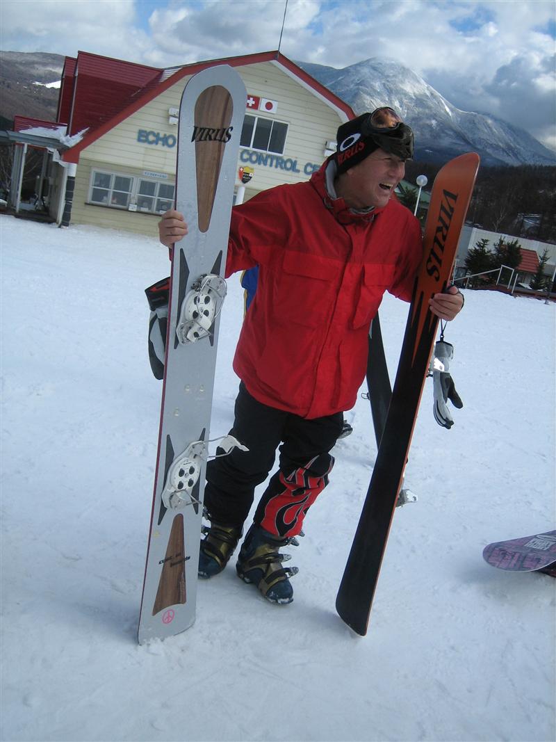 noriderさんが、VIRUSチューナーのnakagawaさんからVampire168を借りてきていました!。本物見るの初めてです!。なにやら日本に1本!みたいです!。チタンです。サイドカーブがあまりありません。キャンバーも5ミリ程だそうです。スタンス幅穴は最小でも49cm!。う~ん・・・謎がいっぱいのしかもかっこいい板です!。すみません・・・試乗させて頂いちゃいました!。