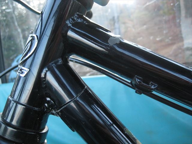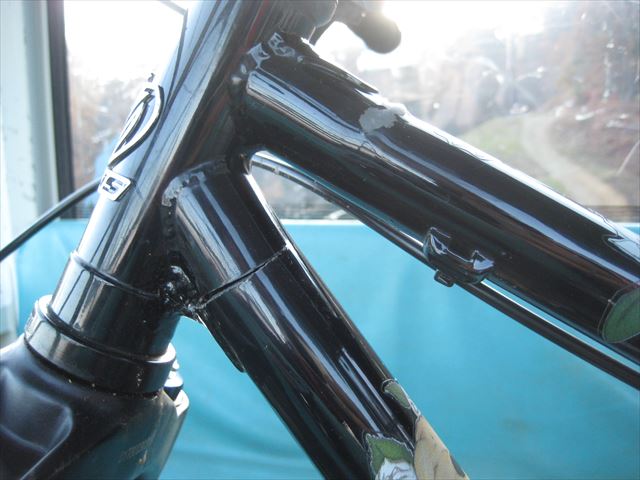 ・・・この前兆は・・・最後の一本の前の時、Cコース中盤でフロントタイヤのリム打ち感があったのです。フロントのリム打ちなんてほぼ無いので、あの「カンッ」って音の時に一気に割れたのだと思います。・・・さらに前の前兆・・・去年なにげにフレーム見てると、ヘッド下に薄っすらヒビ発見。自分で溶接して直しました。今回の骨折箇所はその溶接個所のちょい下。今、思うとMIG溶接したので結構な熱がかかり焼き入っちゃったからかなーとも思います。一気に割れてるのを見ると・・・。ロワーチューブは割れてますが、アッパーチューブは奇麗に盛り上がって曲がってます。さすがクロモリ鋼!。