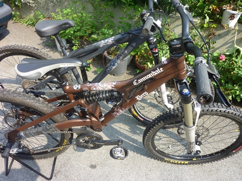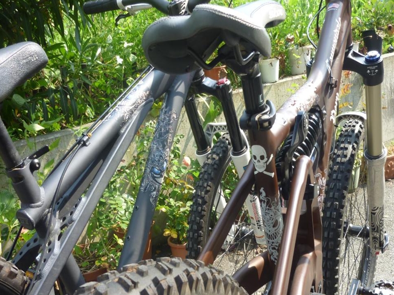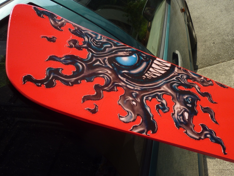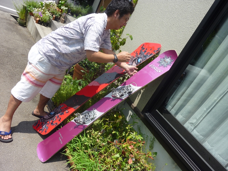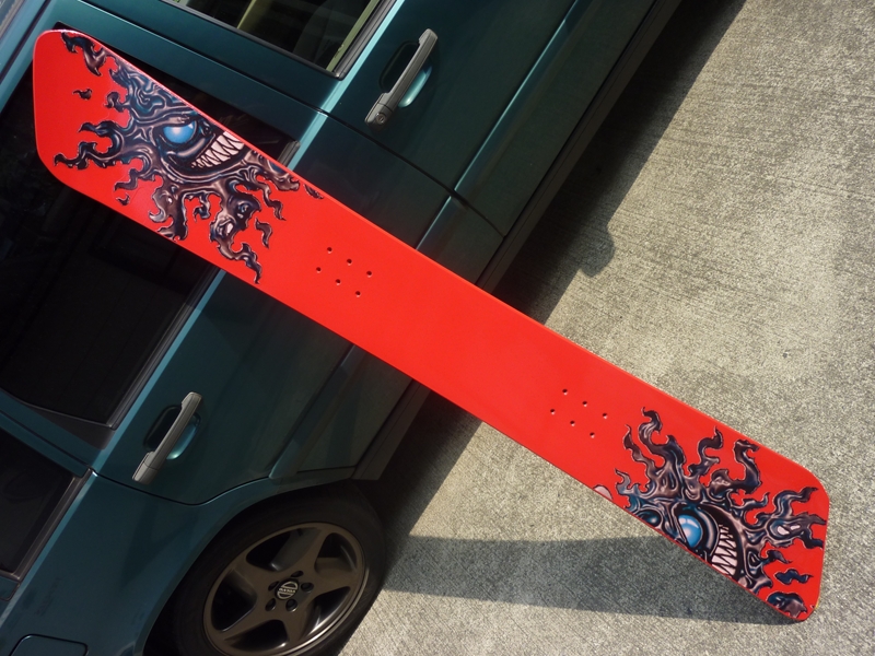 ・・・で、このデザイン、どっかで見た事あるような???。そうです。以前まあじょさんのNigthmareにゴールドカーボン貼って、大きい顔マークを半分入れるというまあじょさんのデザインでした。あの板は、多くの人からsのの?って聞かれますが、まあじょさんのです。sのも何回か乗らせてもらいましたが、sのの乗った事のあるNigthmareの中で一番調子がいいです。oonoさんもそのゴールドカーボンのNigthmareをどこかで見て、おっきい顔にして!ってご依頼されました。あの金カーボンNigthmareは、センセーショナルだったのです。