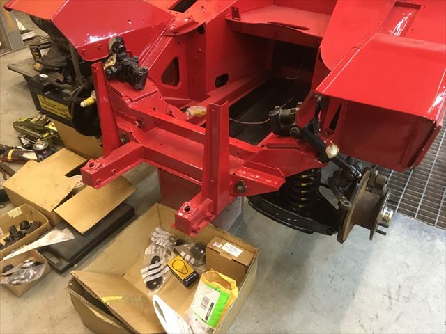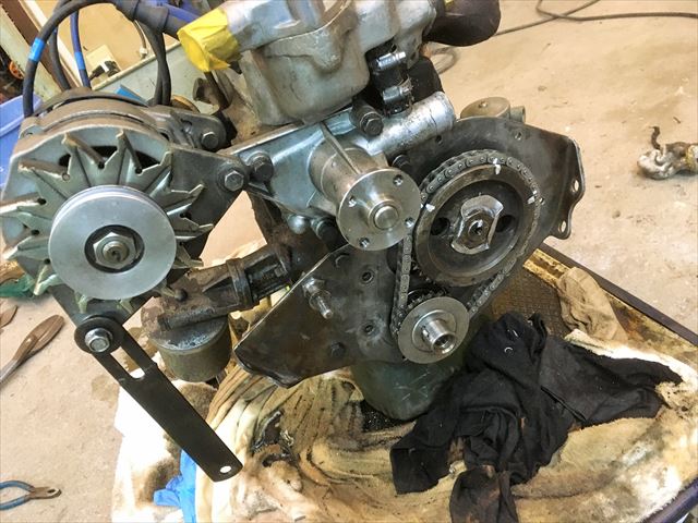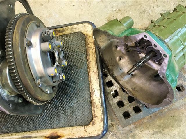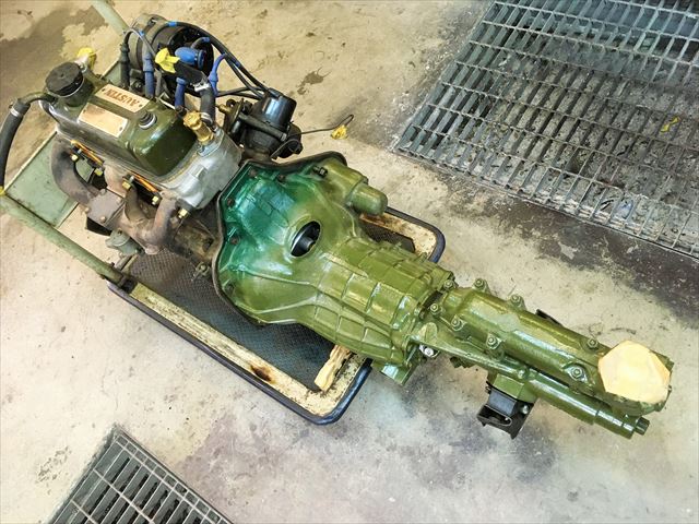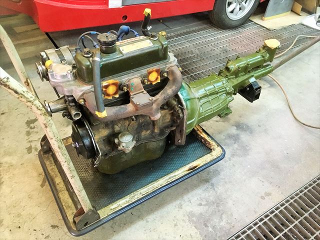 ・・・ミッションはイギリスリビルト品。合体して・・・。この車は合体した状態でフレームに載せます。丁度ミッションの下にフレームがあるので、ミッションだけって降ろせません。エンジンと合体状態で前方に抜き上げて降します。載せる時は逆にミッショントンネルに入れるようにして載せてゆきます。前からエンジンクレーンで吊って。クラッチ交換だけでもエンジン降し( ̄〇 ̄;)。