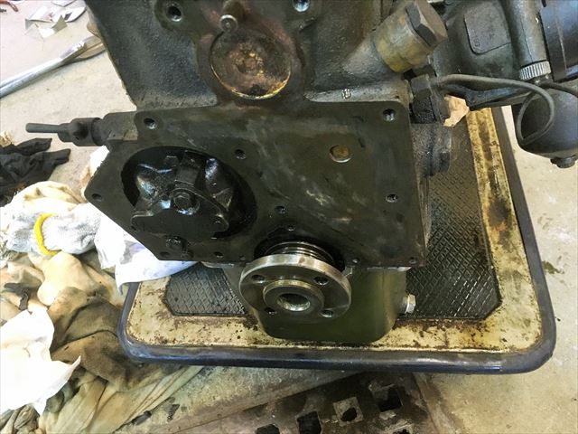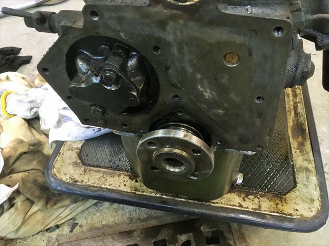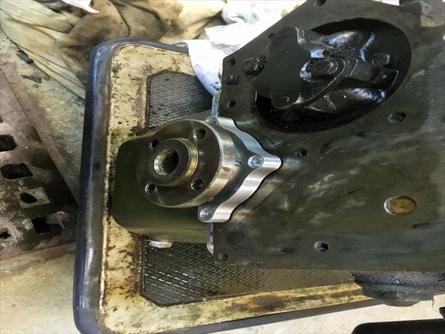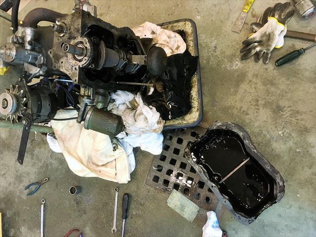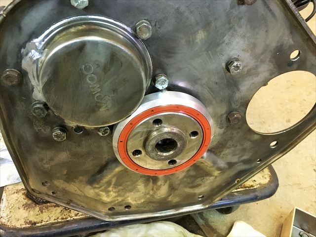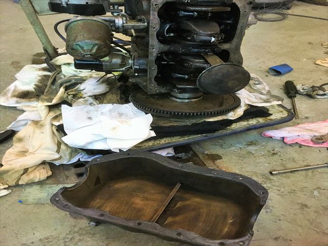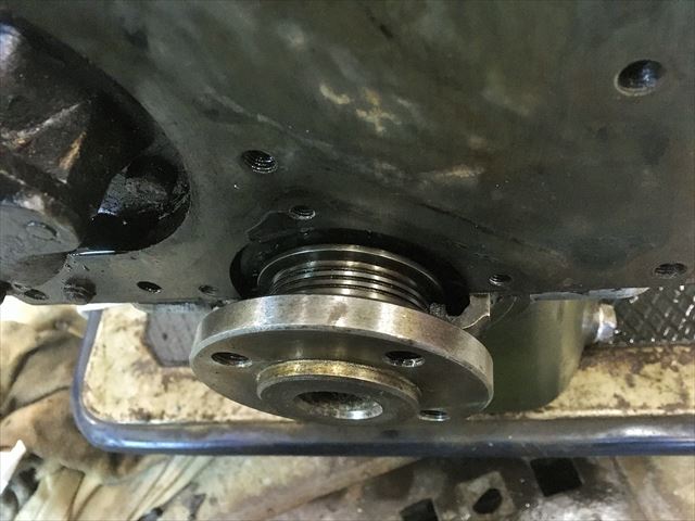 ・・・赤い車のエンジン。エンジン載せる前にオイル漏れ修理。オイルパン外したら・・・すんごいオイル真っ黒&スラッジ&ドロドロ。で、このエンジン、クランクシャフトのオイルシールが・・・前側は付いてますが後ろ側ははじめから無い設定です。クランクシャフト自体に溝は掘ってあって、エンジンの回転と逆方向に掘ってあるのでオイルが内側に戻される仕組み。って言ってもオイル漏れます。漏れるの当たり前です。いや、漏れるの普通で漏れてもいい設計と言っていいです。だってオイルシール無いから。・・・で、社外パーツでリヤシールKit売ってます。・・・のでこれ付けます。
