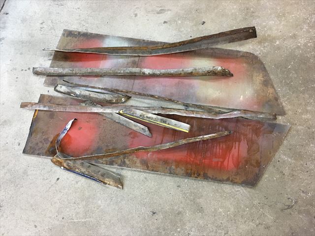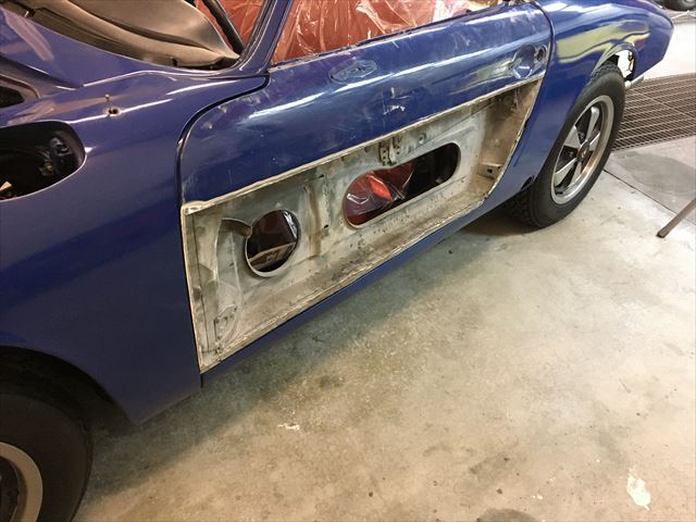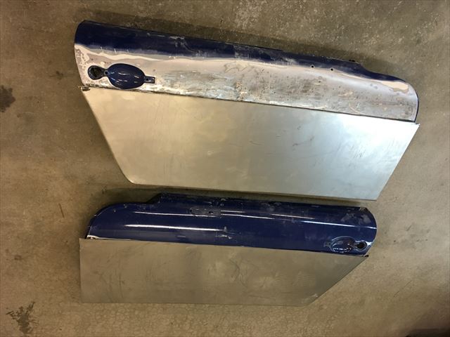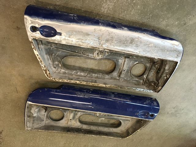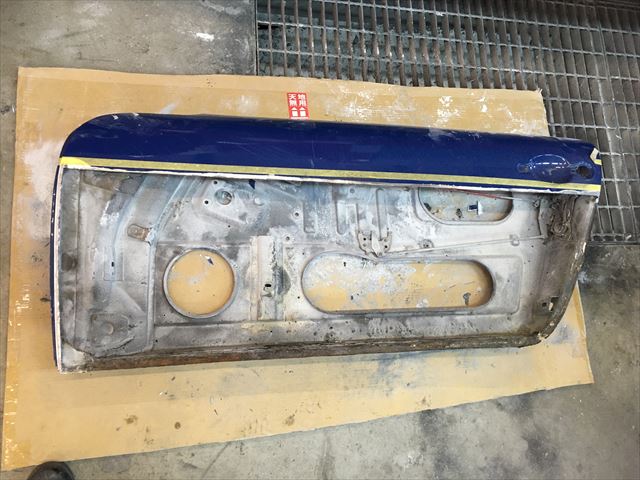 ・・・左右のドア、凸凹波々だったのでパテ結構入ってるな~と思い、でもなんか様子が変・・・。ドア下サイドシルとの隙間が超曲がってて超テキトー。ドア内側よーく見て見たら・・・2/3の鉄板貼り替えてあった( ̄〇 ̄;)。とりあえずの目的は色替えなので、今回は錆びて腐りは無いのでこのまま凸凹だけ直すか?でもドア下の隙間ラインが気に入らない・・・。ど~しよ~~~???。あ、この前FRPのドアに交換したオレンジ号のドアが有る!社長さんに聞いてみたら使っていいよ~て!。・・・で、仮合わせしたら・・・ドアの大きさ微妙に違う、930とこのタルガ・・・( ̄〇 ̄;)。