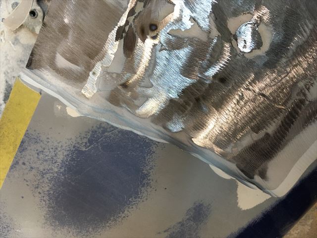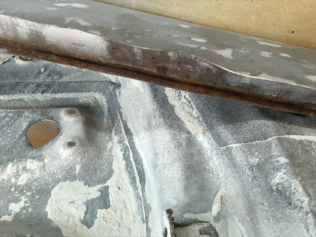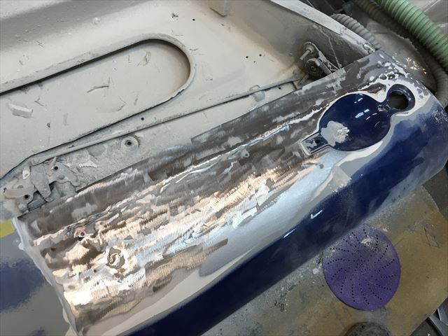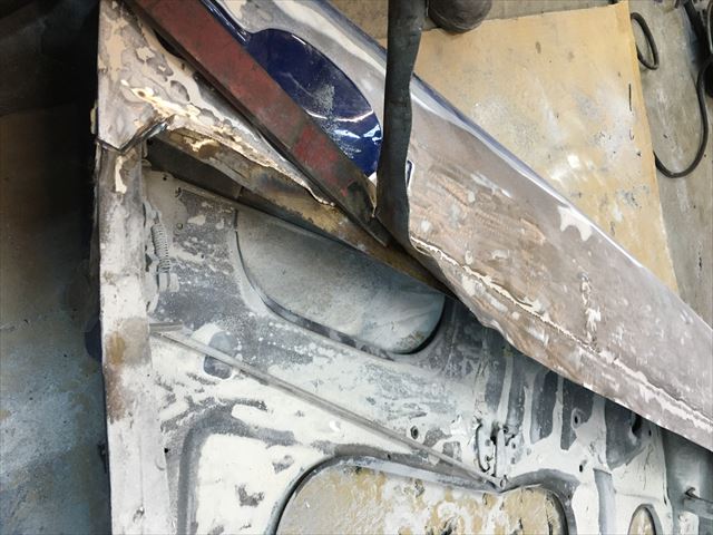 ・・・も~悩んでる時間なんて無いので鉄板貼り替え。ま~しか~しテキトーに直してある事^^;。溶接は突合せじゃなくて元の鉄板に載せて溶接してある( ̄〇 ̄;)。凹ませて溶接してあるのでパテ盛り盛り。ドアふちの折り曲げの精度がテキトーなので、隙間もテキトーな隙間になる。いくら私がやった訳じゃないからってこのままの状態で仕上げて納車する事は出来ないですね。これも縁あってうちに来た訳だし何とかしてくれるからってポルシェ屋さんの社長さんもこんな高価な希少車を任せてくれる訳だし・・・。
