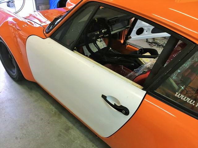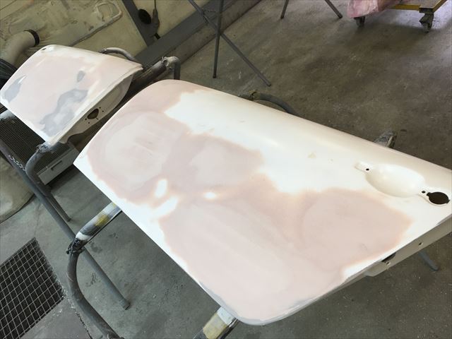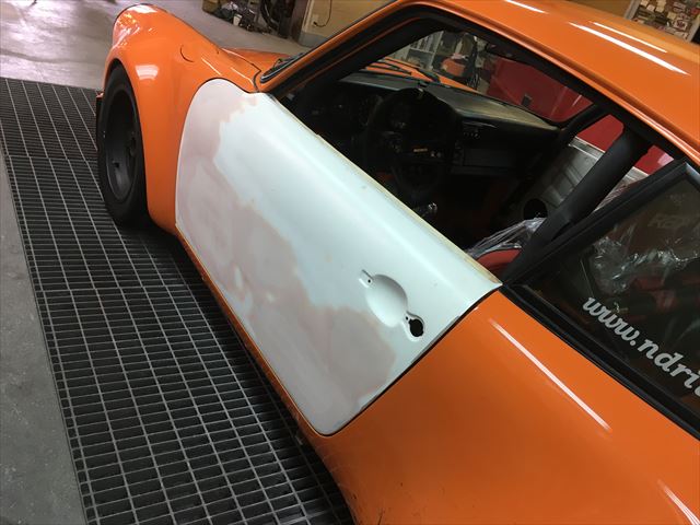 ・・・FRP製品って、原型、例えばこのドアだったら純正ドアから型取りして雌型を作ります。表と裏があるので雌型2つ。その型から表と裏の部品を作り、それを合わせて(接着する)一つのドアになります。それはウイング、ボンネットも同じ。その合わせる時だったり、雌型にグラスファイバーを積層してゆく時の樹脂の硬化状態だったりで表面歪んじゃたりします。たとえばこれが純正部品だったら商品にならない失敗品。社外パーツはこんなの普通。・・・でパテ修正。
