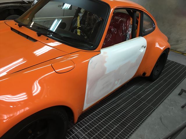 ・・・パテは駄目?なんて話は昭和の時?。パテの代わりにハンダ盛る昔の職人も居ますが、ハンダも割れるし剥離するし・・・。パテも進化して来ていて、厚く盛ったって広く盛ったって全く問題ありません。特に最近の国産車は鉄板ペラペラなので、凹みを叩けば叩く程にその凹みが広範囲に歪み出します( ̄〇 ̄;)絞りで熱入れると余計にベコベコに。なので出来るだけ小さい範囲で歪みが出ないようにピンポイントで引き出し、あとはパテで修正です。全く仕上がりは問題ないですし、ちゃんと行程を踏んでいれば、パテが勝手に割れてくる・・・とか、パテの下から錆びて来る・・・とか、パテが剥がれて来る・・・なんて事は全くありません。・・・裏から手が入らない場合や、鉄板引き出すのに電気溶接使いたくない車の時なんかはパテオンリー。ってそもそも新車でもパテ使ってるし、FRPボディーなんて車体全部ほぼパテ入ってますからね^^;。なので?パテは駄目、良くない事なんてないです。錆びの上とか錆びで穴開いたとこにパテ入れるとか、ちゃんと足付け処理しないとか、硬化剤が少ないとかちゃんとMix出来て無いとかは論外。あとカーショップのなんちゃってパテは駄目です。