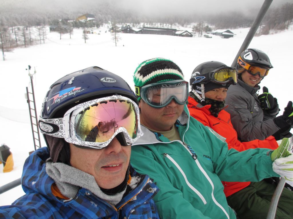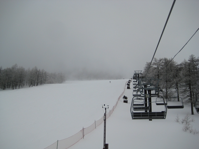 ・・・11時になってもまだガスだったので、先に昼飯食っちゃいますかー作戦決行!・・・それが功を奏して?か、ガス薄くなってきたので11時半、3時間遅れでゲレンデin!・・・。それでも濃くなったり薄くなったりのガスと戦いながら・・・湿雪が積ってボコボコ気味のステージ2と戯れながら・・・12時半頃やっと青空見えてきたのです!。