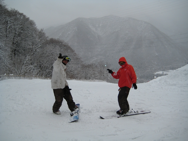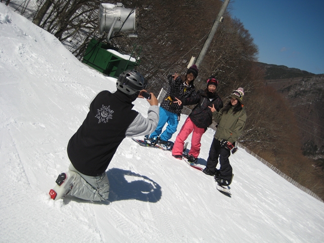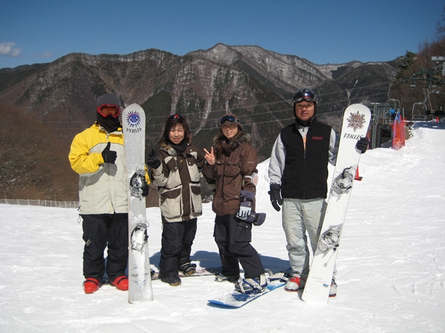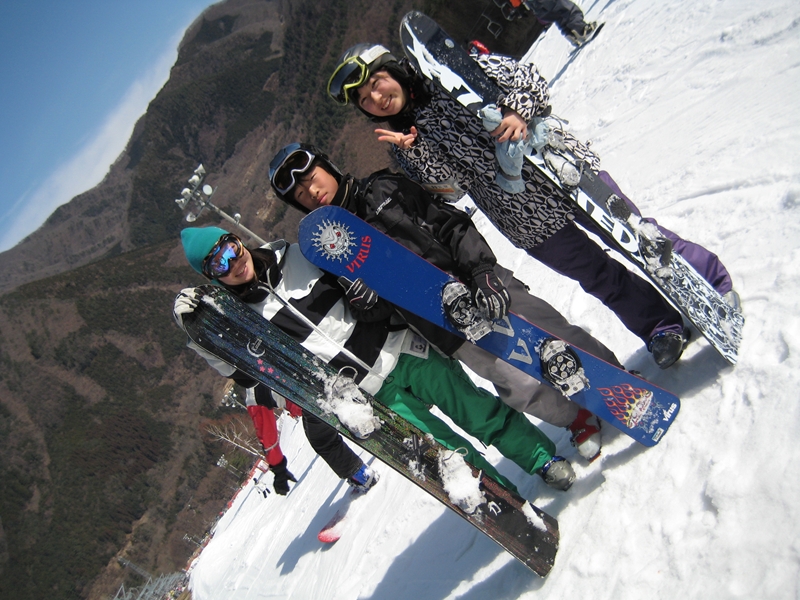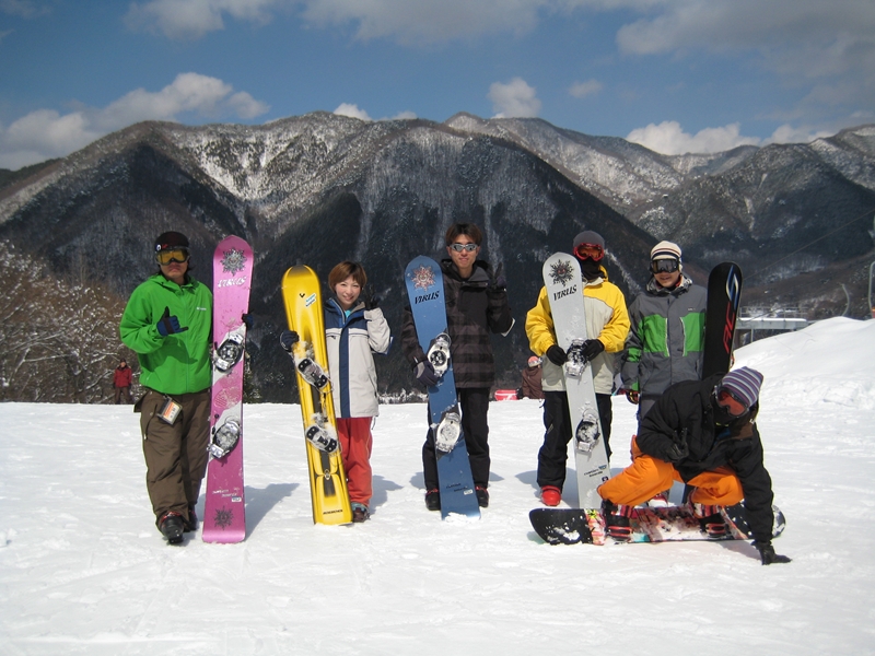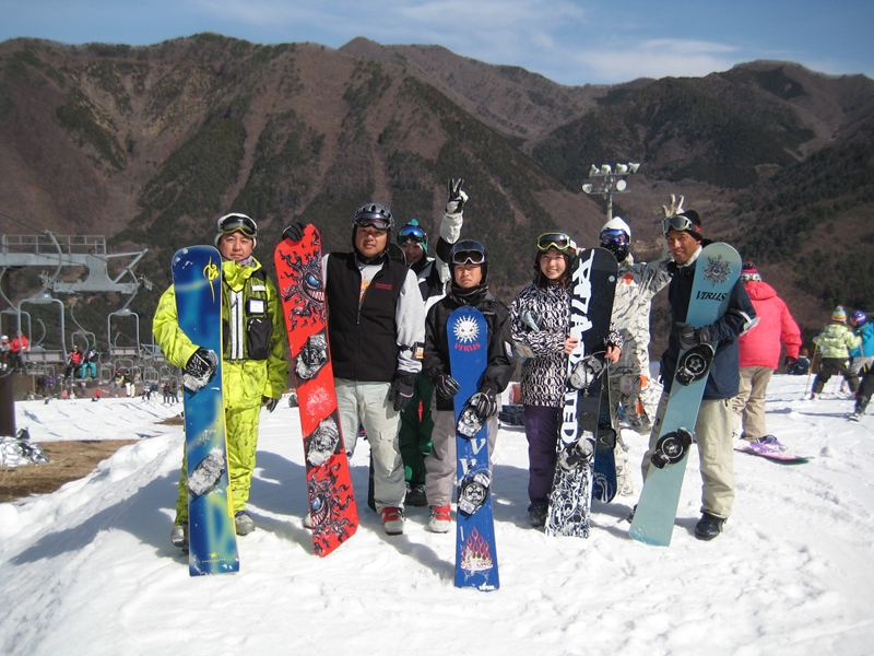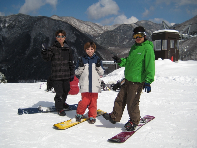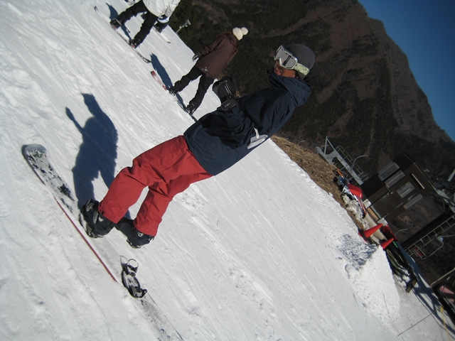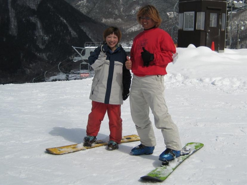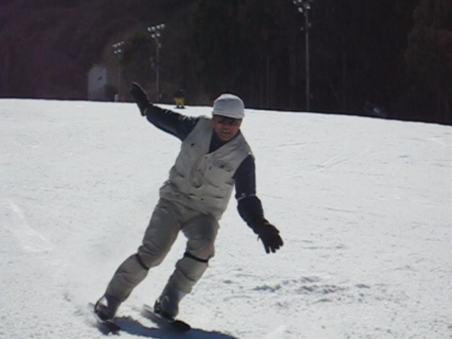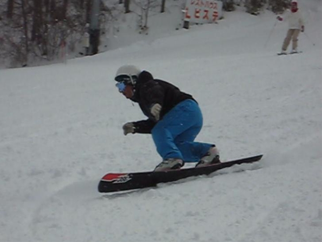 高校生?大学生?・・・なんせちひろよりもぜーんぜん背がちっちゃいし、ニコニコしててカワイイから・・・(汗)。でもホントは小学生のお子さんが二人居るお母さんなんだそうです!。スノーボード歴は長いそうですが子育てで滑れなかった時があり、でも今はお子さんも小学生になったのでご主人にお子さんを見てもらってちょこちょこ滑りに行っているそうです。男の鏡!みたいな素晴らしいご主人さんですね!。ちなみにご主人はフリースタイル、奥様はアルペンなんだそうです。・・・ですが、滑りに行くのはほとんどが平日でお一人でバスツアーなんだそうで、一人でも滑りに行っちゃうって事はそれだけでもスノーボードが好き!って言う思いが伝わってきます!。