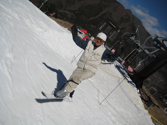 そんなリフトのおじさん、今日はスキーしてました!。作業服?乗って来た車はトラックで、荷台には桃の農家の人が使う脚立積んだまま!そうかー・・・本業は農家のおじさんだったのか?。