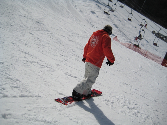 今日は曇りのち雨予報でしたが、日中は晴れ間もあったりで天気もっちゃいました!。気温は高め+まだまだ天然雪バーンでGB、LEVEL5!。今日はちょこっと滑って帰るかな・・・なんて思ってたけど、こんなにいいバーンなので結局午前中滑っちゃいました(汗)。