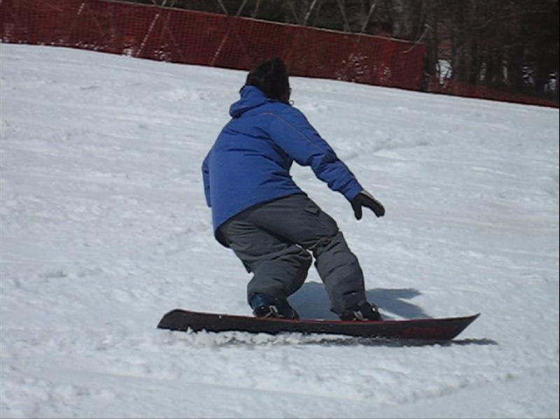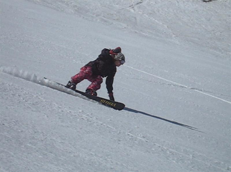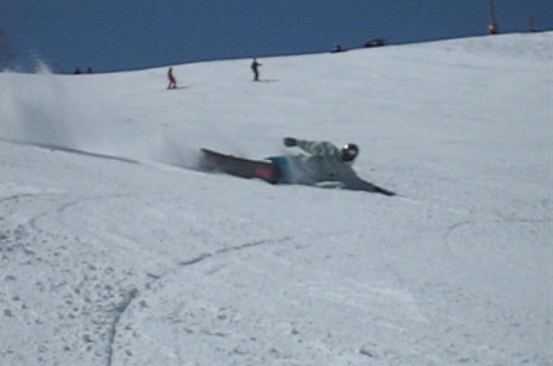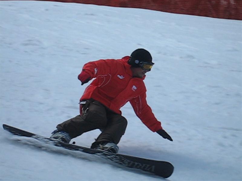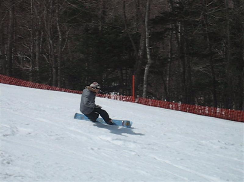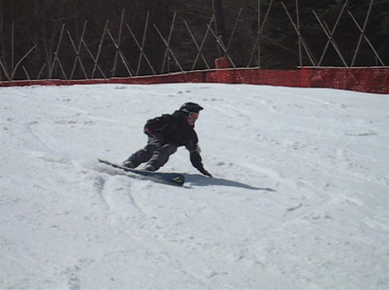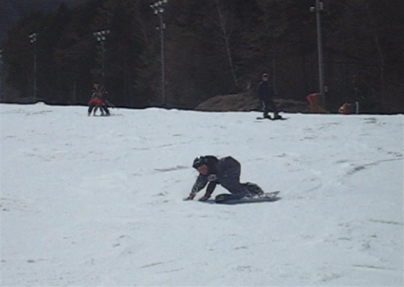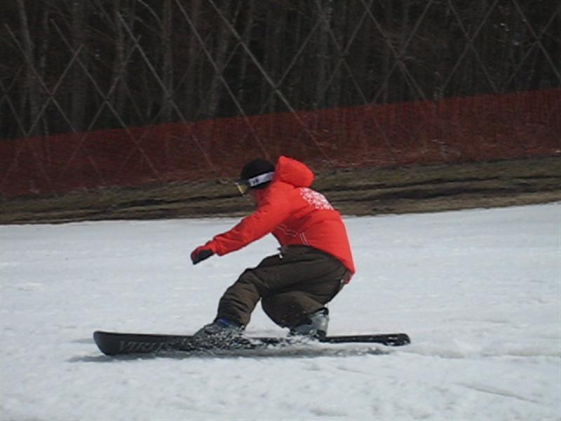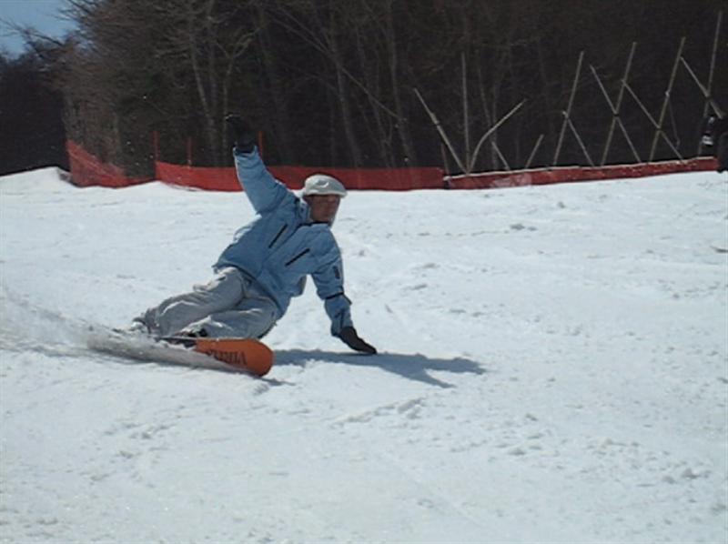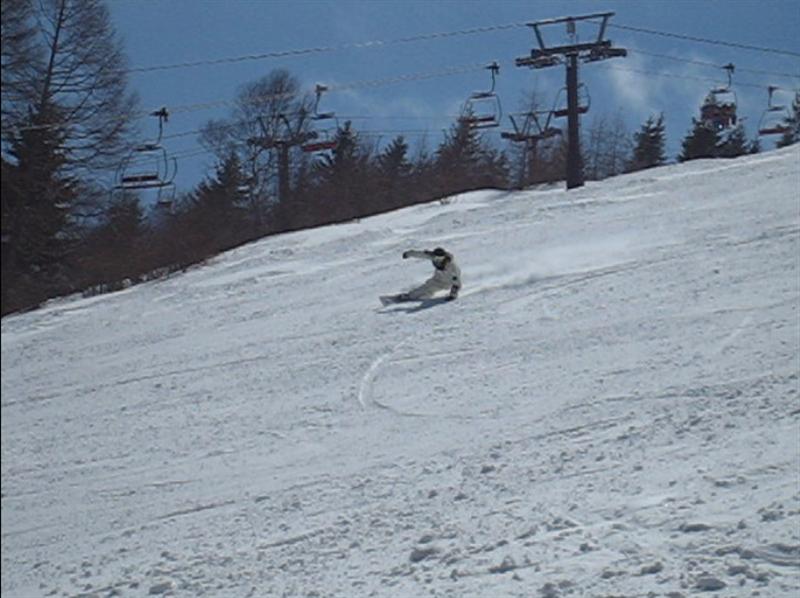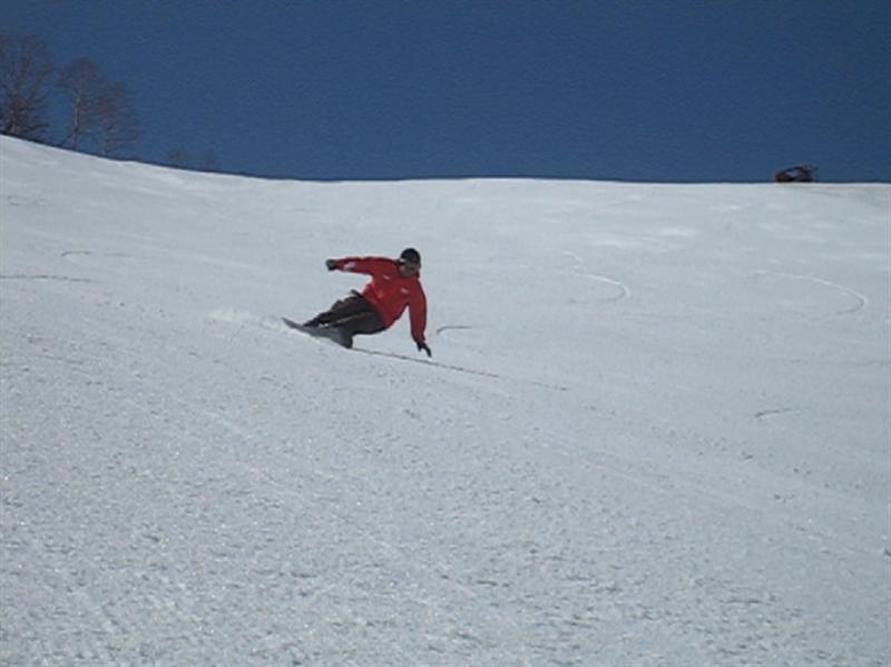 ・・・で、せっかくのレーシングモデルなのでこの板に合った滑り方で滑ってみたほうが・・・と思い、akiyamaさんに最新のレーシング滑りを教わりました。後ろ乗りでぎゅーです。
