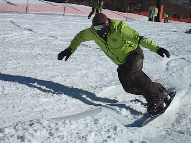 それじゃ~谷周りで圧を感じるには、とにかく自分から圧を掛けて行かないと曲がってきません。常に抱え込み抜重です。棒立ちスタイルだと常にパワーカービングです。切り返し直後からフル棒立ちでストレート体軸を作ると減速感の無い高速ロングカービングに突入です。
