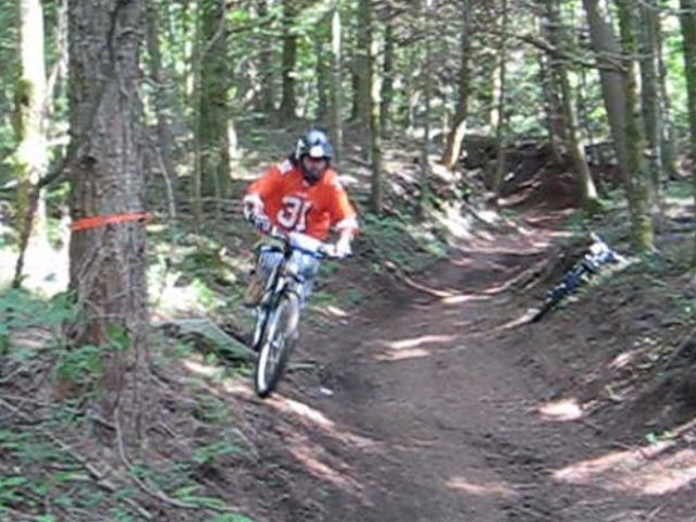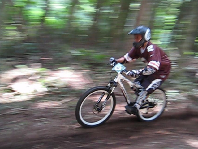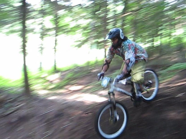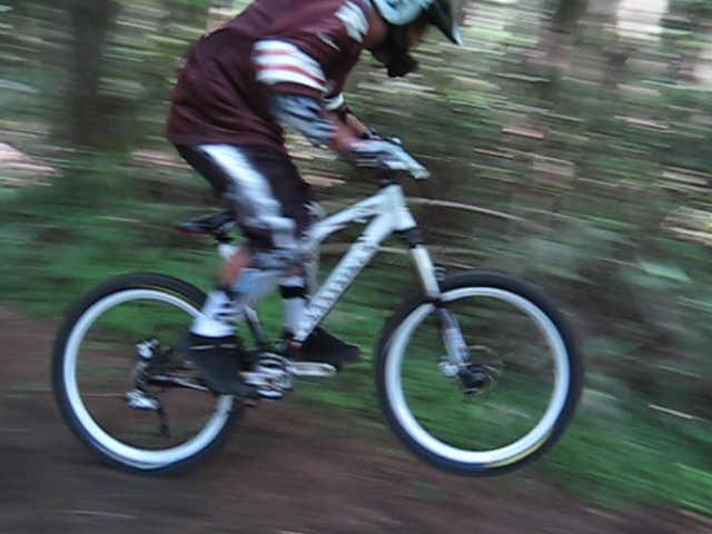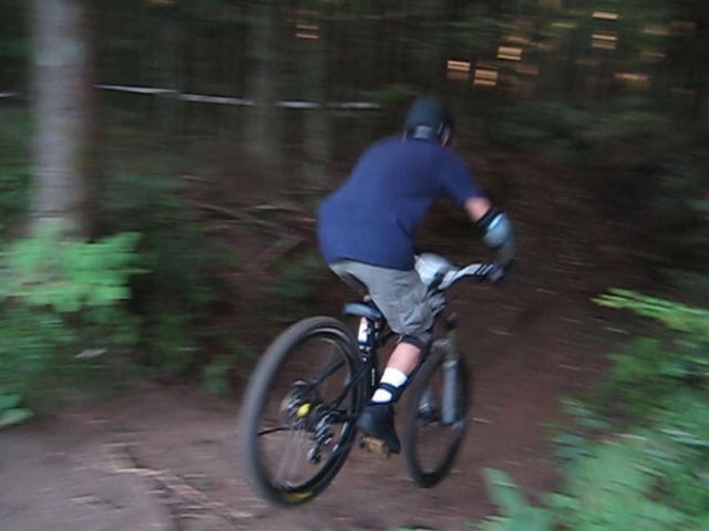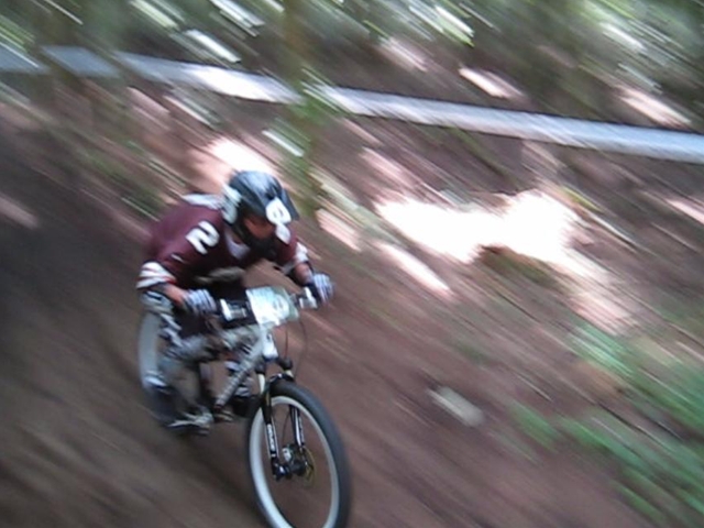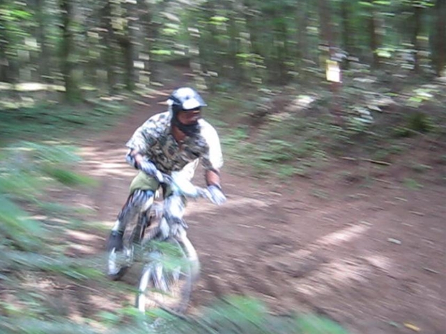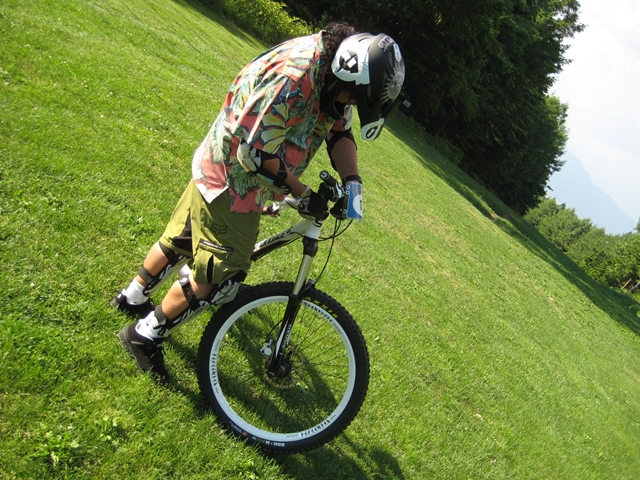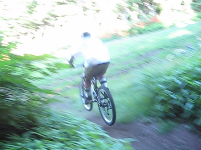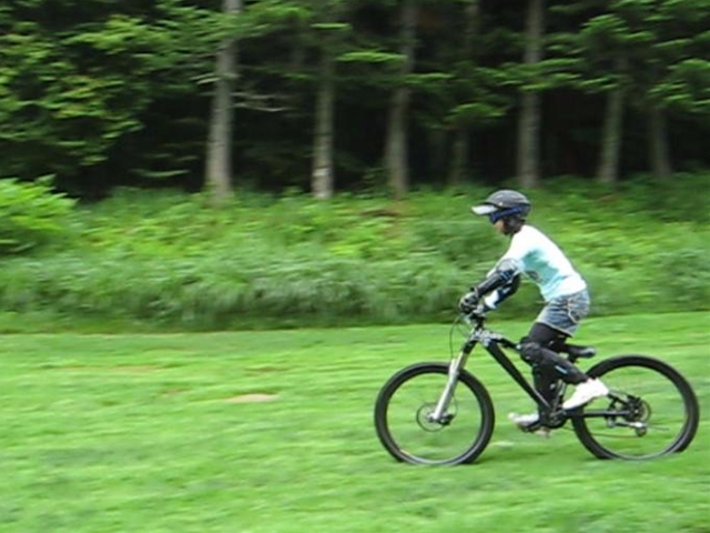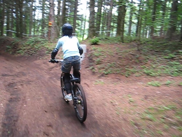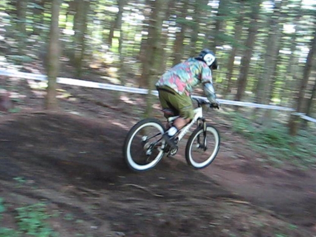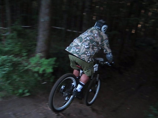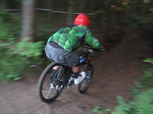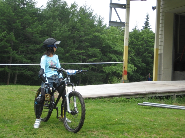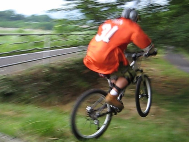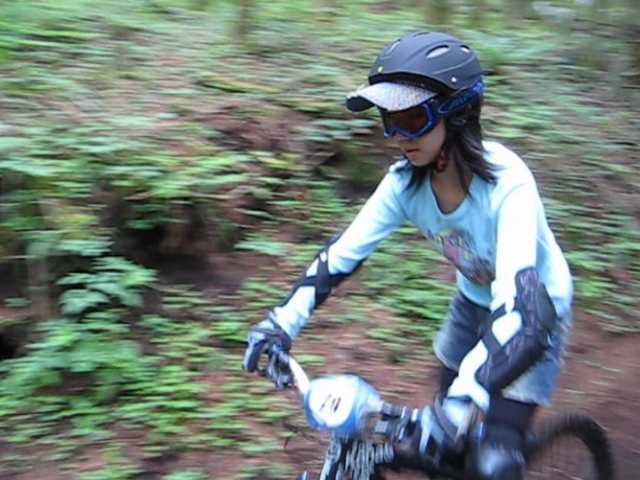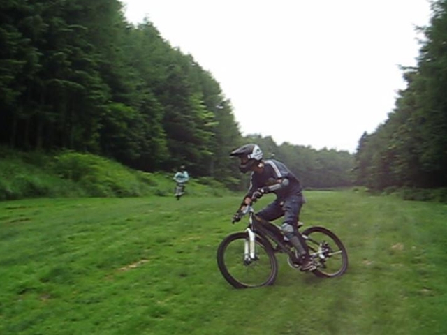 まずは芝コースでですが、スタンディングのニュートラルポジションのいい事!。腰が引けずにしっかりと上半身のウェイトがストレートに腕を通してフロントサスペンションに伝わってます!。よくあるパターンは、怖いから腰が引けてお尻が常に後輪上部にあり、フロントサスペンションが使えていないと言うパターン。特にハードテールはフロントサスを有効に使いたいですので。なっちゃんは実にいいポジションだと思いました!。最後は馬車道下部もok!。