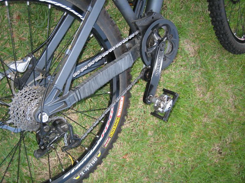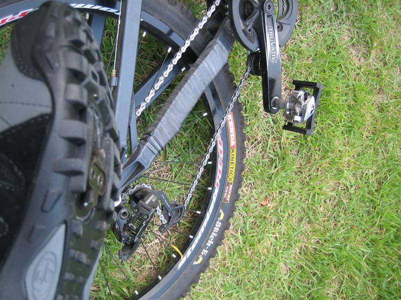 あと、ちゃりんことの一体感と言うか、足を使った操作性がまるでアルペンスノーボードみたいな感じです?。それは・・・ビンディングで固定されているので両足引きつければどんな状態でも抜重出来るし、ペダルから足が外れる心配が無いのでどんな状態でも踏み、引きでリヤタイヤにトラクションをかけられるし。コーナー中、足裏から伝わって来る感覚なんて、まさにアルペンボードにハードブーツな感覚。SPDってすげ~楽しい!って思いました。